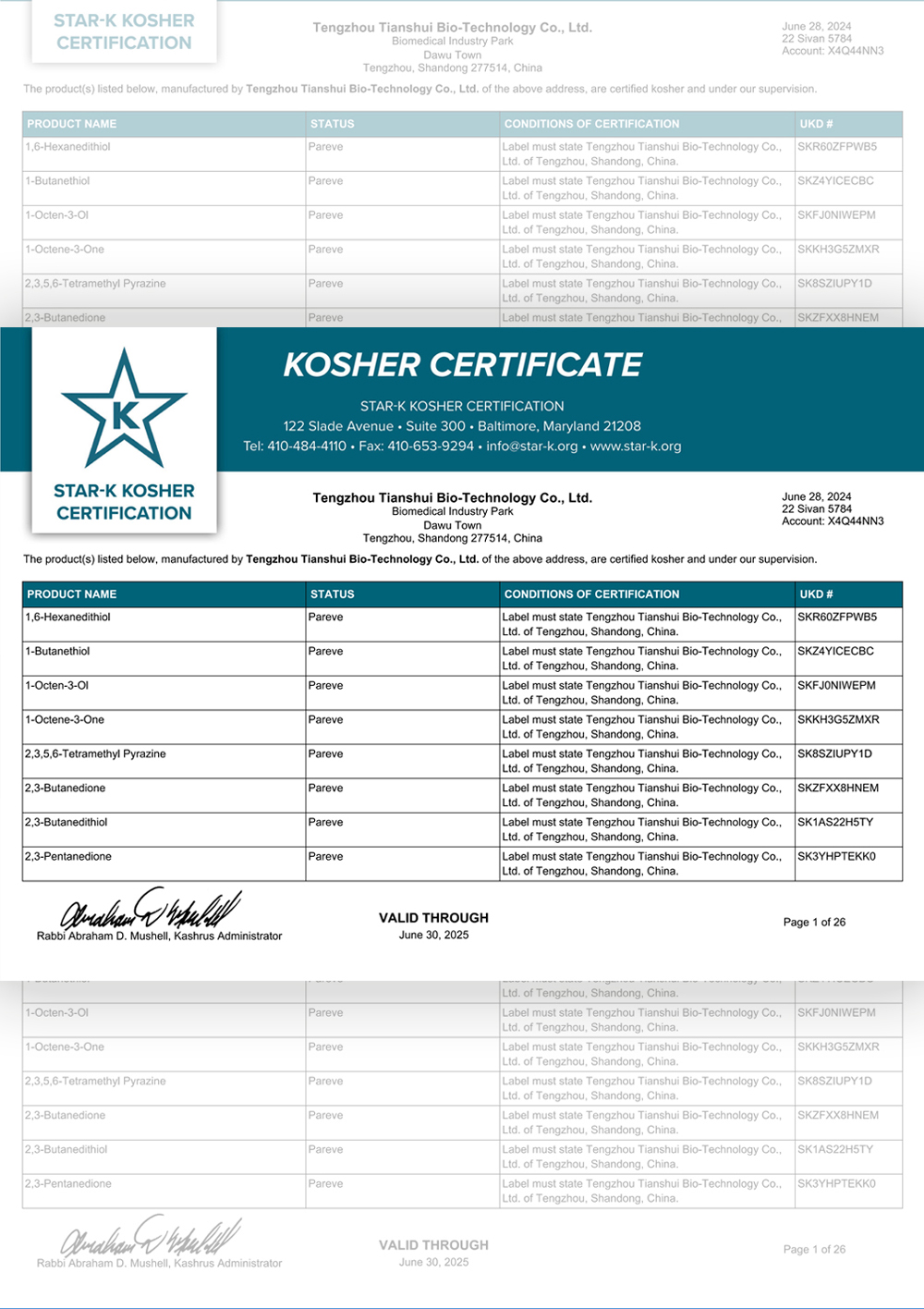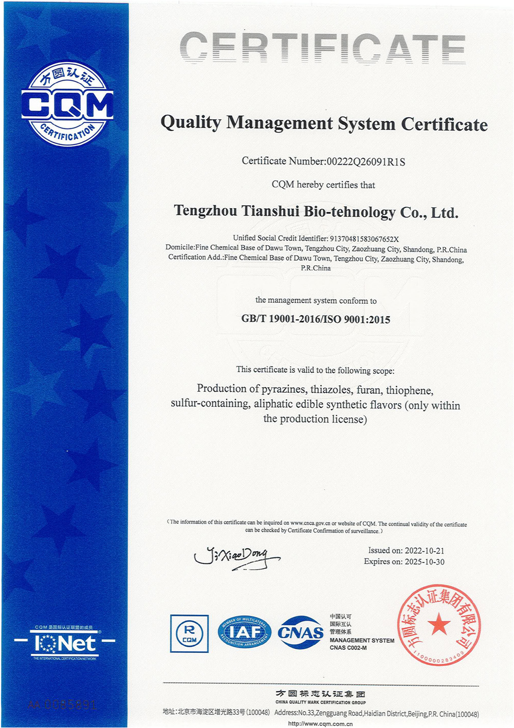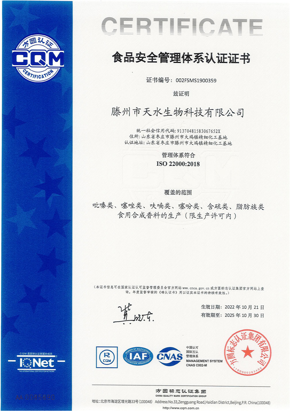 滕州市天水生物科技有限公司成立于2011年9月,是目前國內雜環(huán)類合成食品香料、日化香料和醫(yī)藥中間體生產經(jīng)營的綜合性企業(yè)。坐落于山東省滕州市生物醫(yī)藥產業(yè)基地,總投資5000余萬元,占地面積約30000平方米,員工百余人。公司先后被評為高新技術企業(yè)、專精特新中小企業(yè)、科技型中小企業(yè),建有市級重點實驗室1處,并先后獲得ISO9001質量體系認證、ISO22000食品安全體系認證、kosher認證和Halal認證。是香精香料及食品配料協(xié)會會員單位及滕州市中小企業(yè)協(xié)會理事單位。